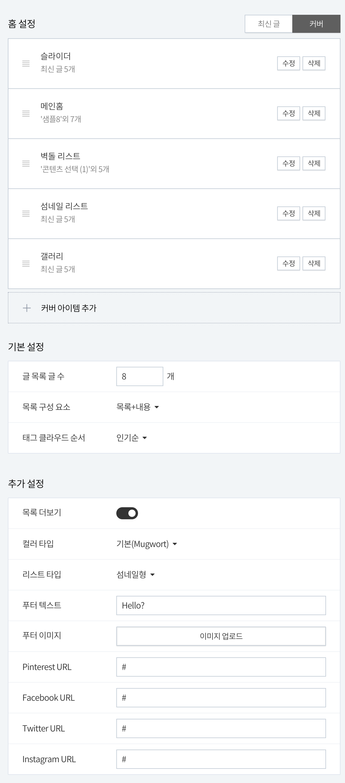 그리고 Poster 스킨에서 사용할 수 있었던 홈화면 컨텐츠도 없애지 않고 수정해봤어요.