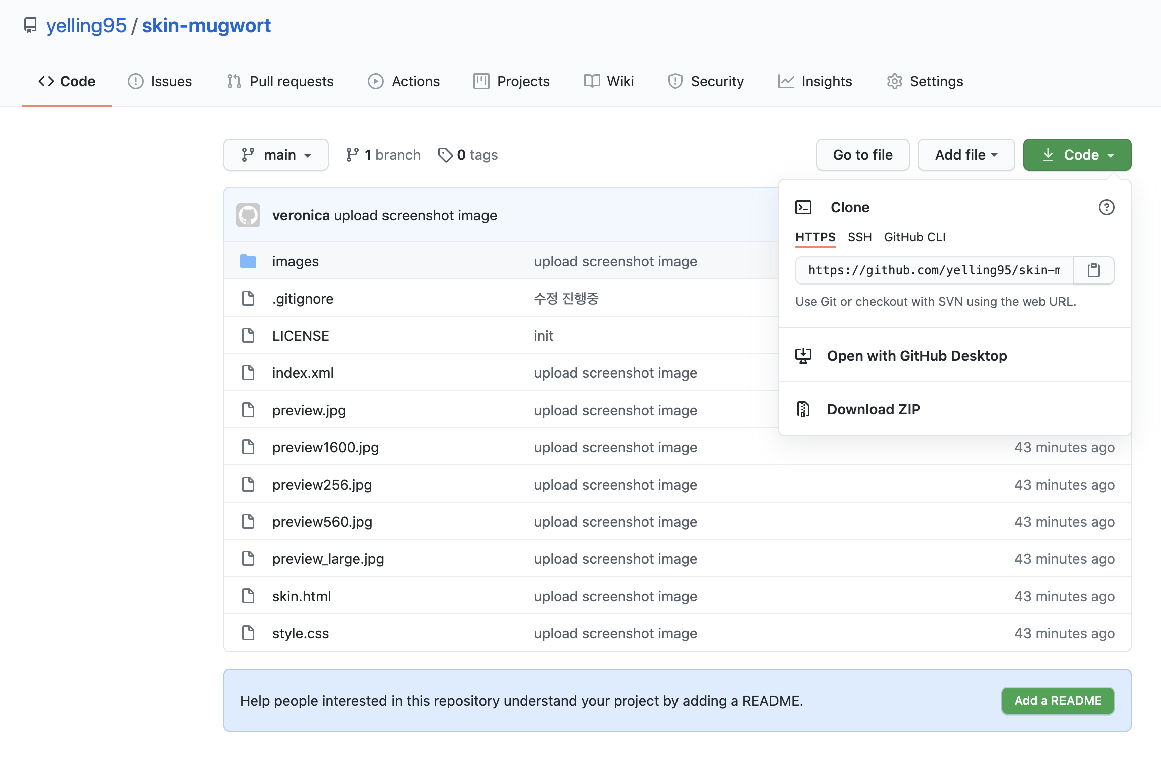 5. 꾸미기 -> 스킨변경 -> 스킨등록 -> 파일업로드(images 폴더에 있는것도 올려주세요!) -> 추가 -> 적용하면 끝!