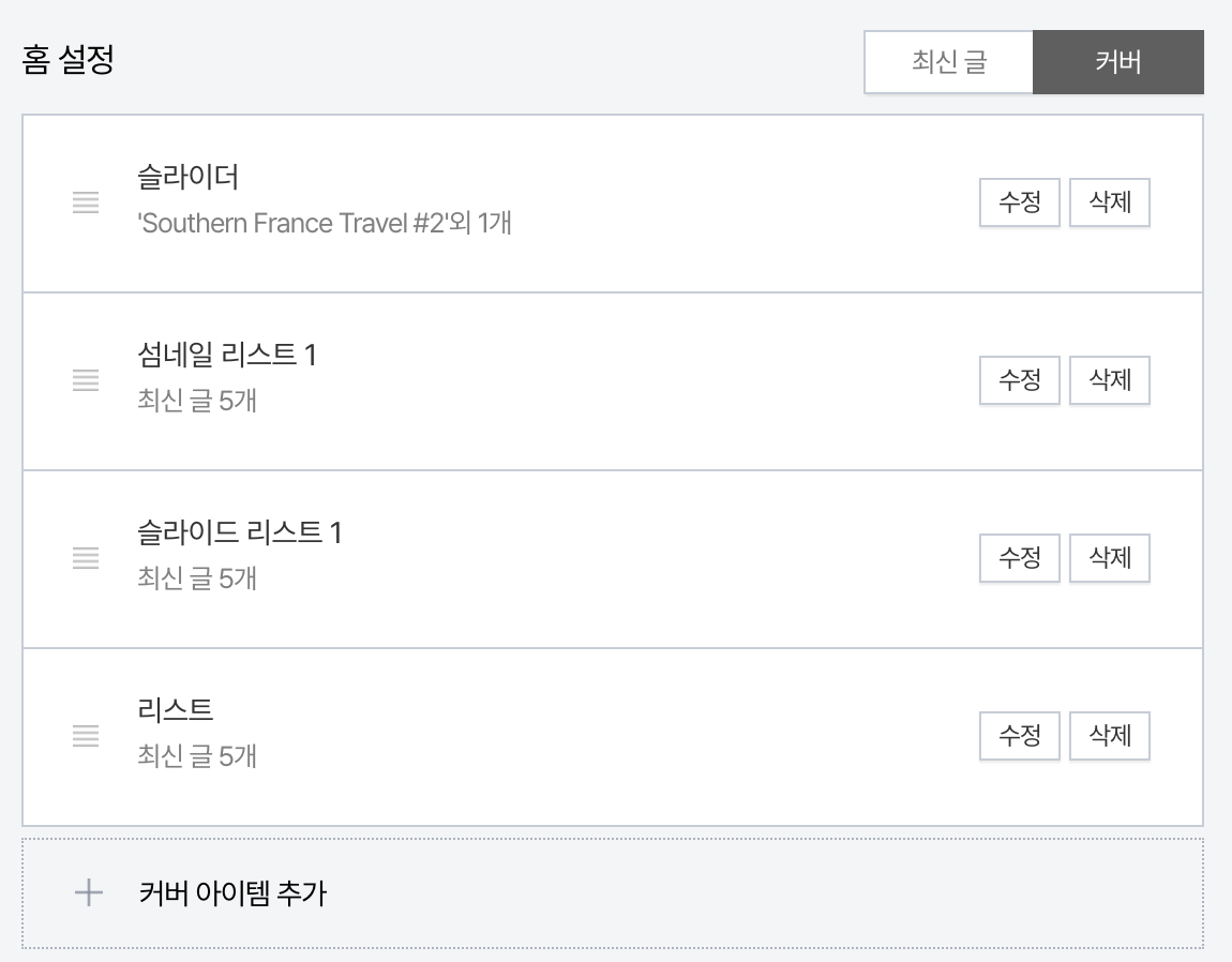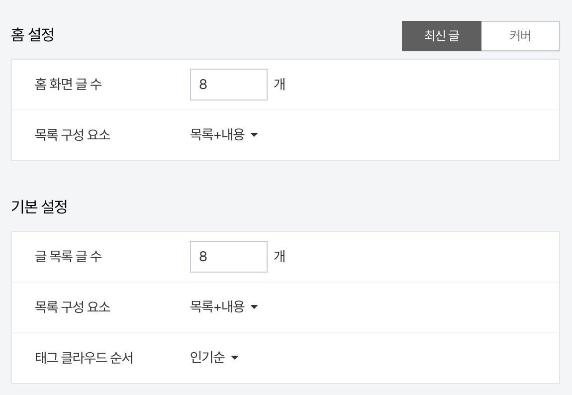 최신글 / 커버 스타일로 나눠서 홈화면을 설정할 수 있습니다