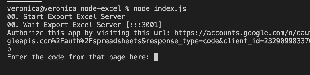 Client Id는 데스크톱 ID로 만들어도 잘된다. 만든 후 credentials.json 파일을 프로젝트 폴더에 넣고 아래 소스 코드와 같이 작성된 js 파일을 실행하면 아래 이미지처럼 url 접속해서 인증하라고 한다.