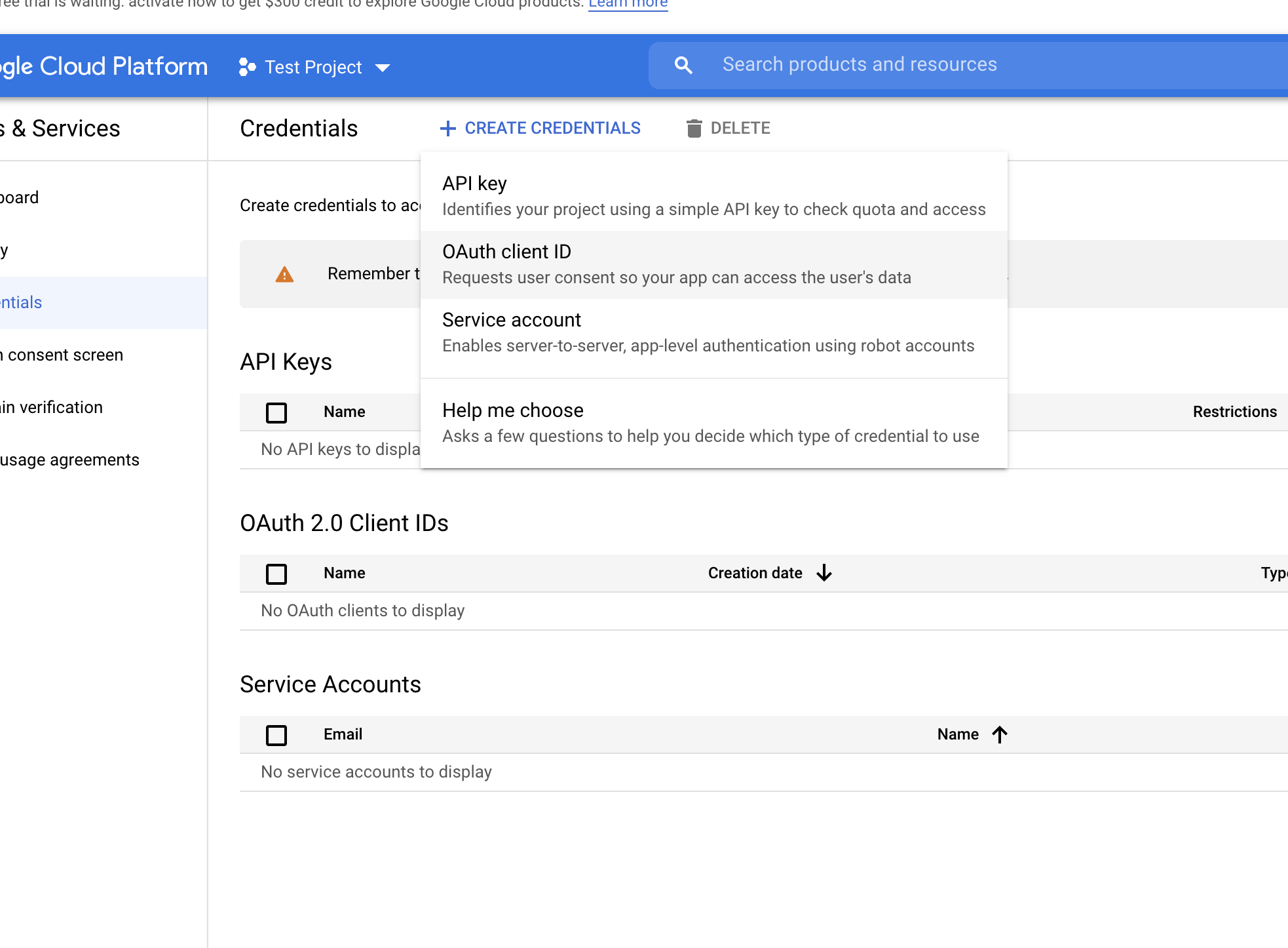 가장 첫번째로, Google API Credentials 페이지에서 OAuth 2.0 Client Id을 만들어야한다.